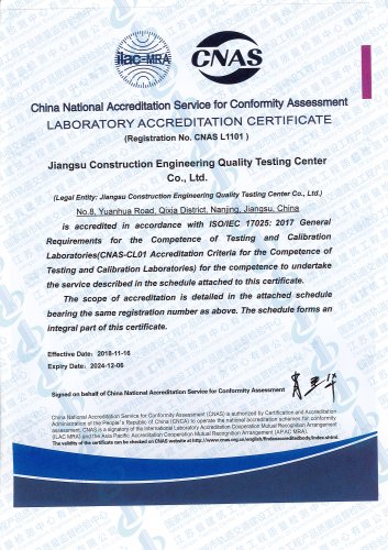 國家城市軌道交通建設(shè)工程產(chǎn)品質(zhì)量監(jiān)督檢驗(yàn)中心, 依托江蘇省建筑科學(xué)研究院和江蘇省建筑工程質(zhì)量檢測中心在城市軌道交通建設(shè)工程領(lǐng)域的綜合技術(shù)優(yōu)勢(shì),于2016年10月獲得國家認(rèn)證認(rèn)可監(jiān)督委員會(huì)批準(zhǔn)授權(quán)..